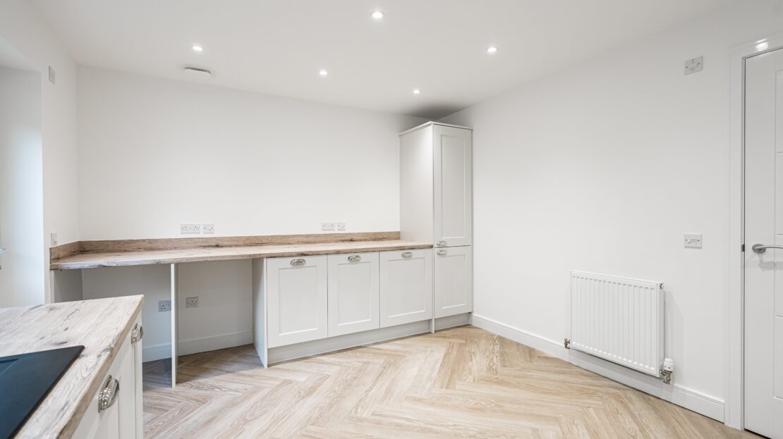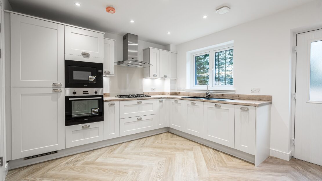 Kitchen and utility areas will have 100mm upstand to match the worktop and glass splashback to hob (where applicable)